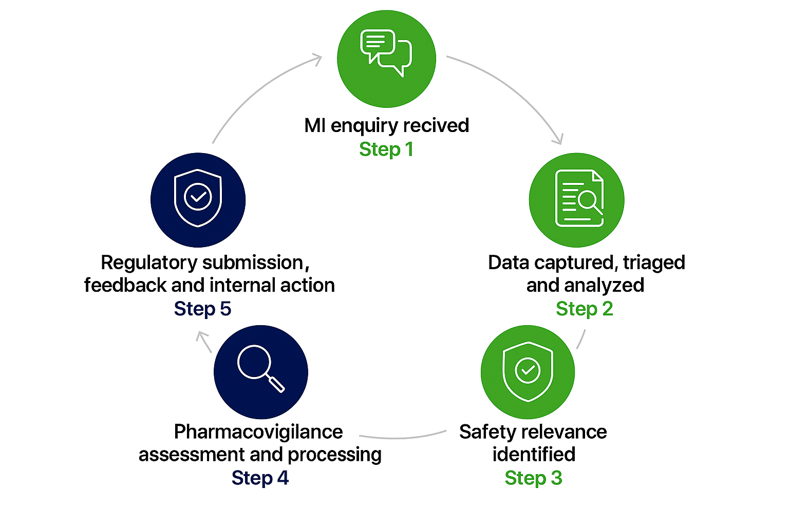 Medical information services handle enquiries, document responses, and track product details that may relate to safety or quality. They serve as the first line of contact between your company and the people using your products. Through these operational activities, Medical Information generates structured, real-time insight into how products are understood and used in clinical practice. Each interaction can uncover potential adverse events or product issues that pharmacovigilance teams need to review when safety relevance is identified and managed through defined MI–PV handover processes.